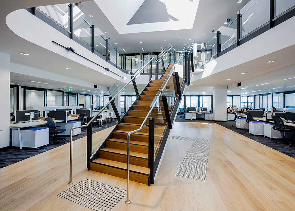 The three level Lindt & Sprüngli head office projects boldly from the warehouse. The steel structure – some of it exposed to support the feature stainless steel mesh – is clad in aluminium composite sheeting and glass curtain wall, which compliments the buildings clean lines and contemporary design.